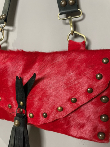 Χειροποίητη τσάντα με δερμάτινο ιμάντα. Όψη με τρίχα